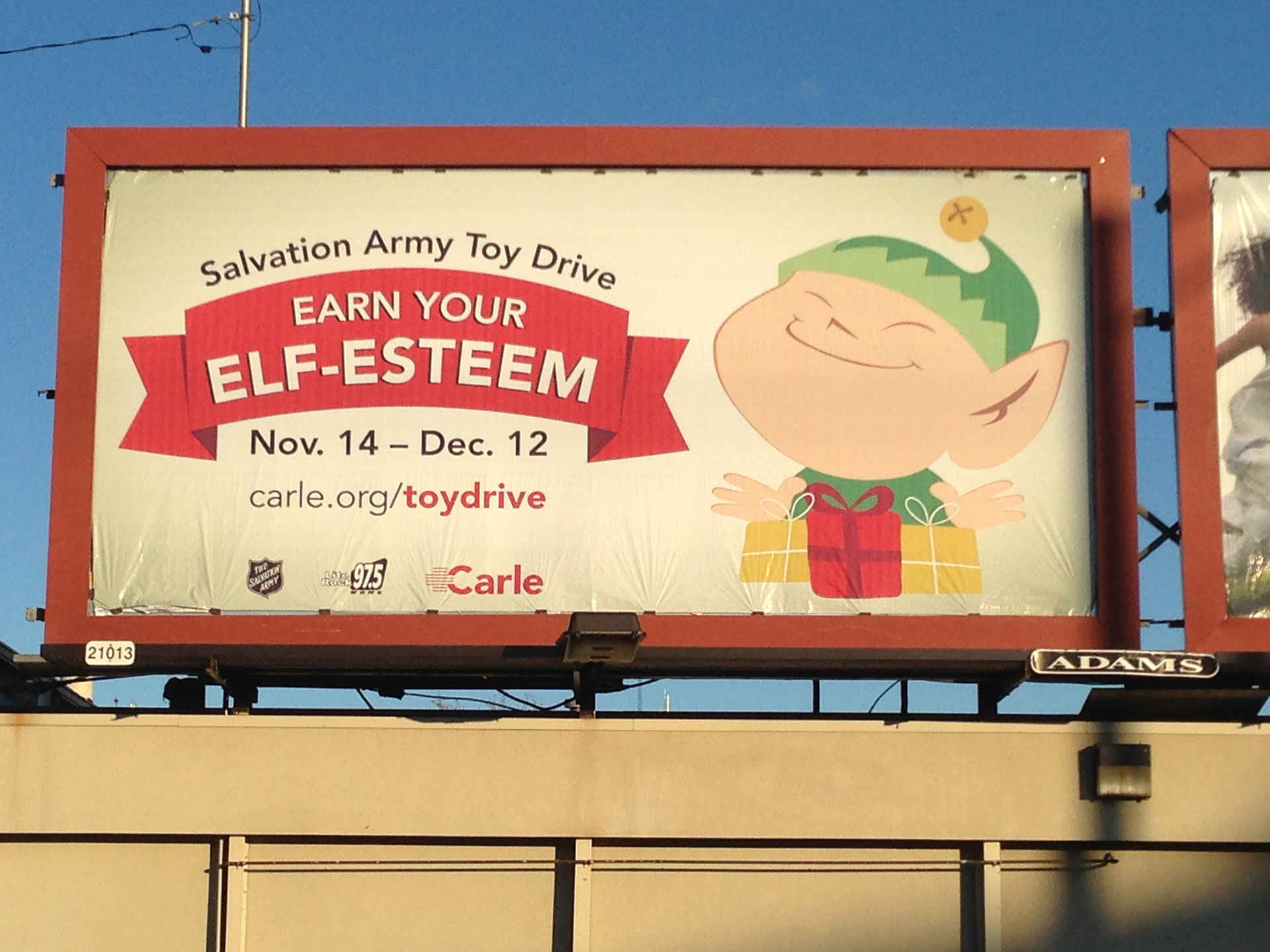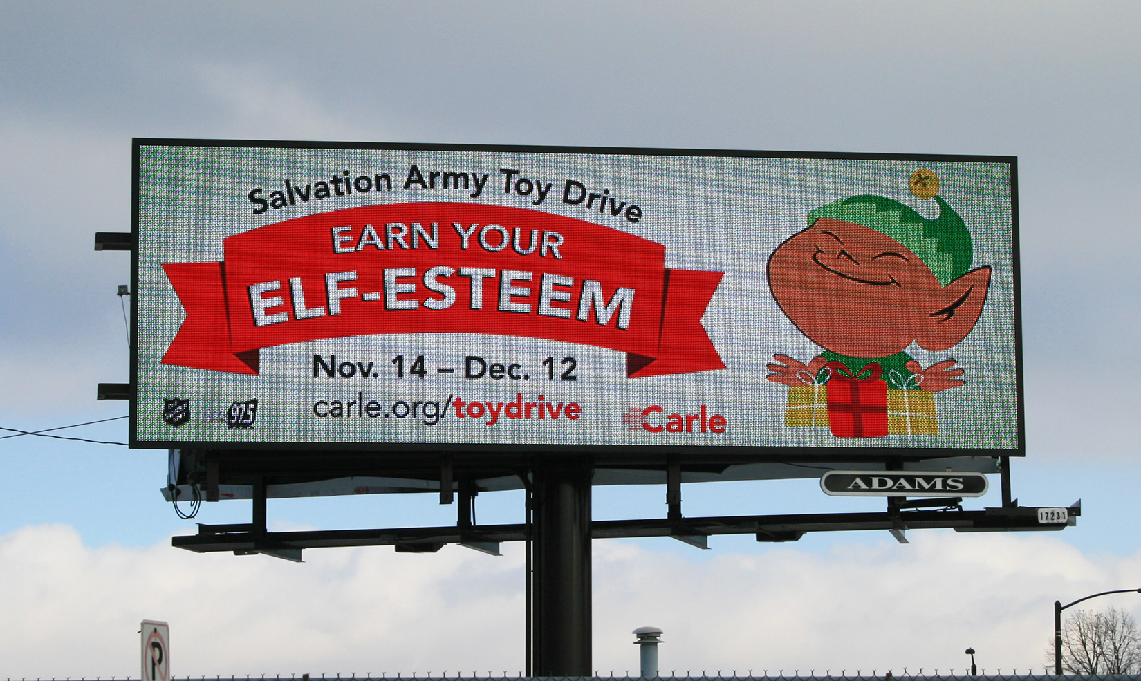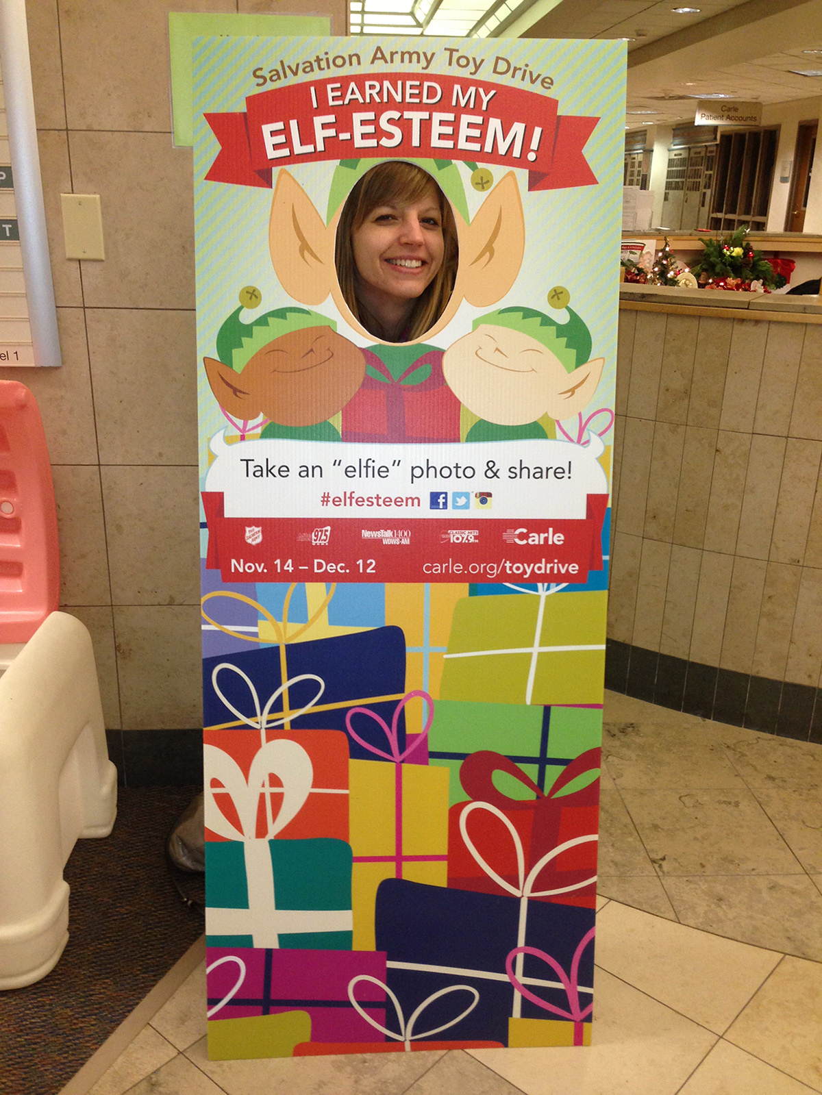 2013 Carle/Salvation Army Toy Drive campaign Integrated marketing campaign encouraged donations to the annual Carle/Salvation Army Toy Drive November-December 2013. The campaign helped garner 2,200 toys and $2,000 in monetary and gift card donations for children in need in Champaign-Urbana, Ill., and the surrounding communities. Campaign included: • Outdoor • “Elfie” cut-out to mark toy drop-off locations • Cut-out ears for donors after they earned their “elf-esteem” • Infographic poster • Web banner on carle.org • Facebook timeline art Campaign also included print ads, videos and social media backgrounds with same art, plus posts on social media and pitches that led to mentions in local media.